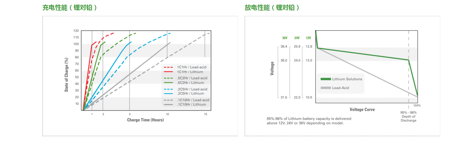• 与铅酸电池相比,从 0% 到 100% SoC 的充电速度更快