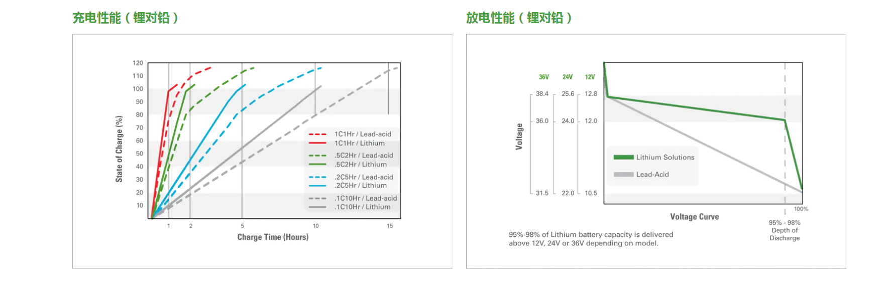 • 与铅酸电池相比,从 0% 到 100% SoC 的充电速度更快